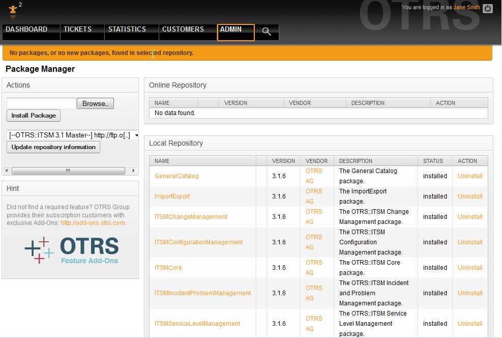 如果您运行OTRS的主机能够访问互联网,可使用如下的在线软件仓库 [--OTRS::ITSM 6 Master--] 来安装下面的软件包。否则下载下面的软件包并使用软件包管理器来安装它们: