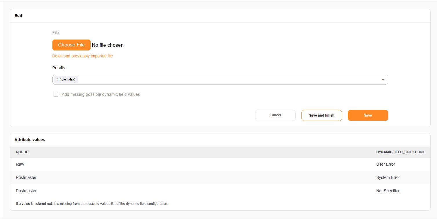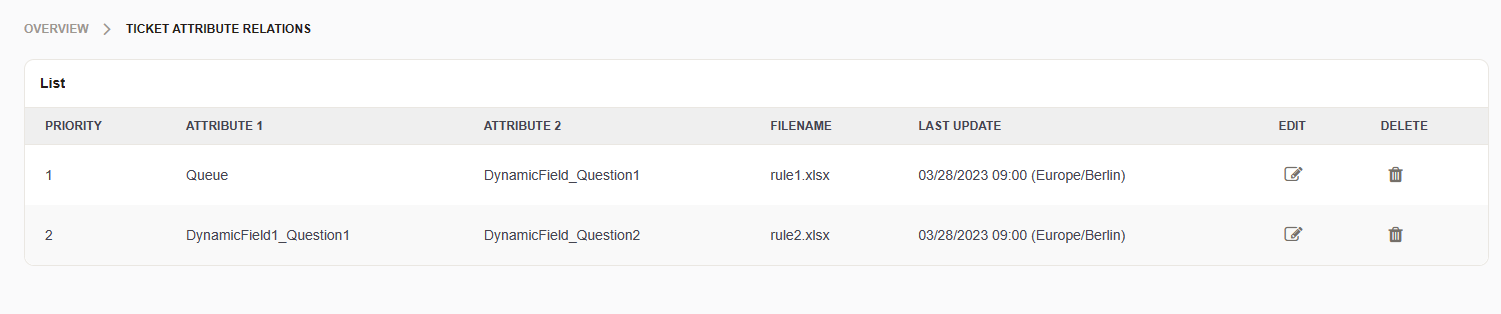 Ticket Attribute Relations is a feature for create and manage relations between all kind of ticket attributes. The dependencies are managed via CSV/XLSX files and can be used to create relations/dependencies between ticket attributes.