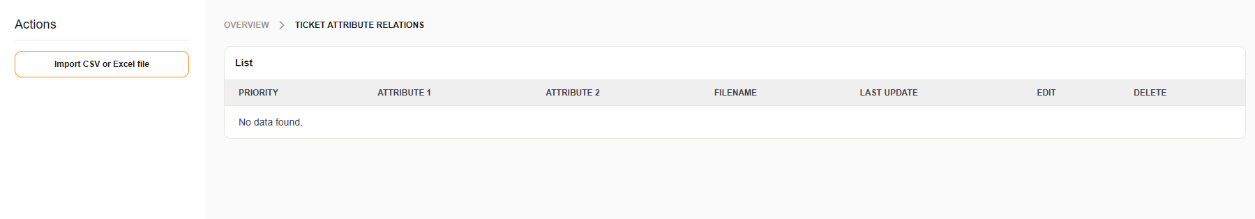 When you select the attribute relations module, a list of relations and an button for uploading relations is shown.