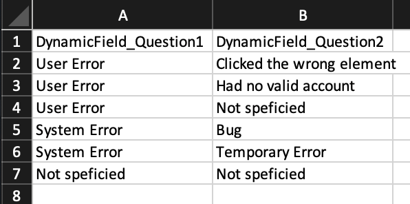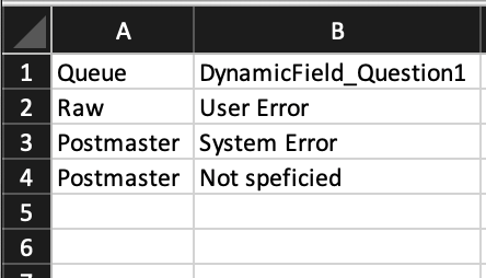 In our example the Queue influences the selection of the Dynamic Field “Question1”. The appropriate structure in Excel is as follows: