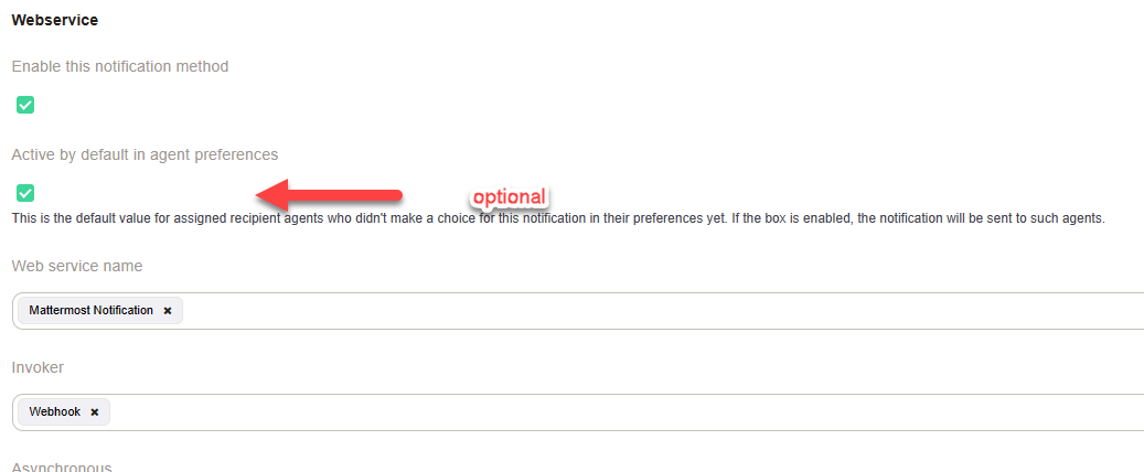 By adding the new created web service to an existing notification we finalize this example. Open the existing ticket notification Ticket create notification and scroll down block Web Service of the section Notification Methods. Select your web service and the invoker, check asynchronous and save your changes:
